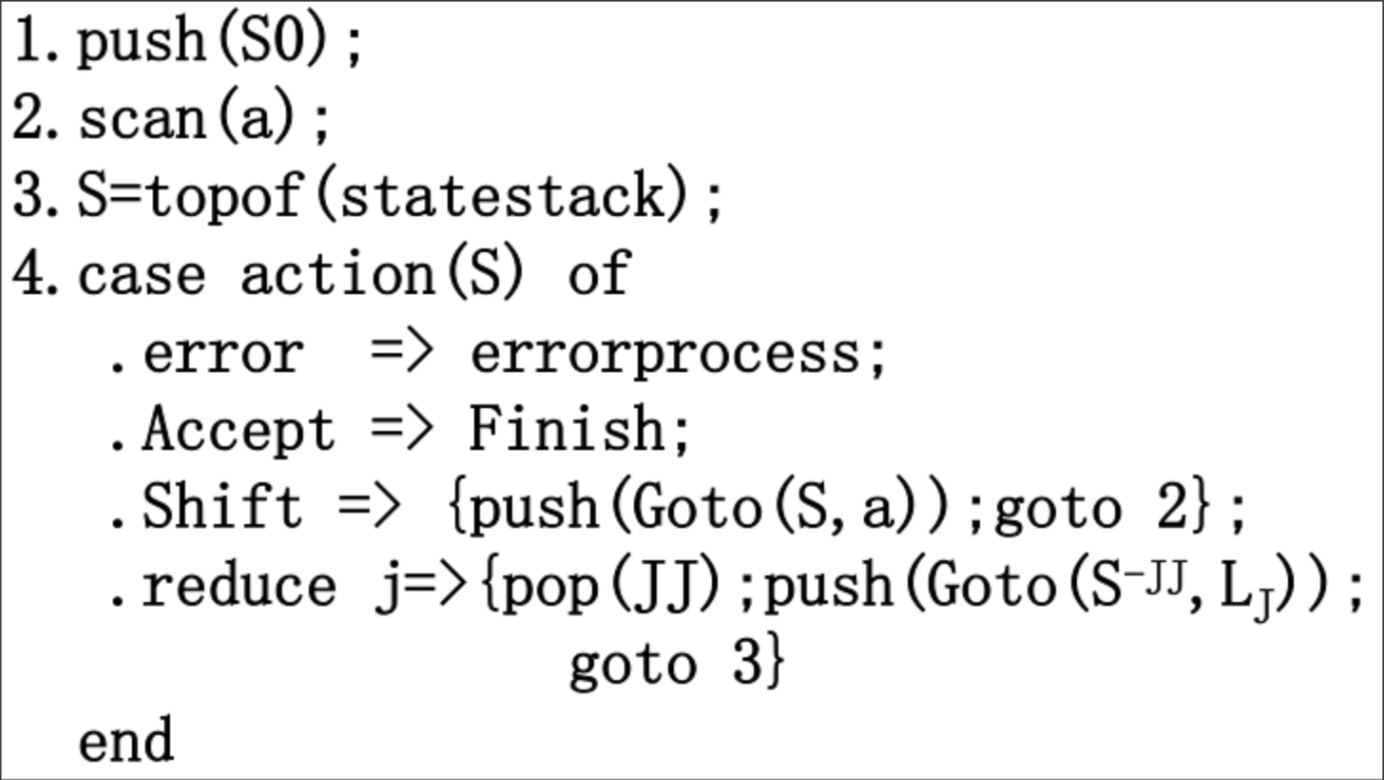 \[\begin{align*} Action(S_i, X) &= \begin{cases} s_j, & \text{if there is an edge } S_i \xrightarrow{X} S_j, \\ r_j, & \text{if } S_i \text{ contains only reducible } Production_j, \\ Accept, & \text{if } S_i \text{ is an accepting state}. \end{cases} \\ Goto(S_i, X) &= j, \quad \text{ if there is an edge } S_i \xrightarrow{X} S_j \end{align*}\]Using LR parsing tables